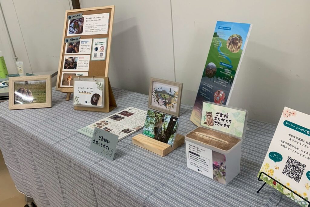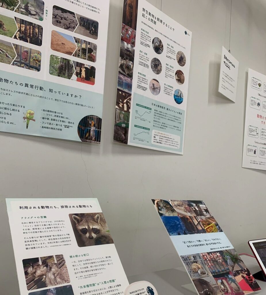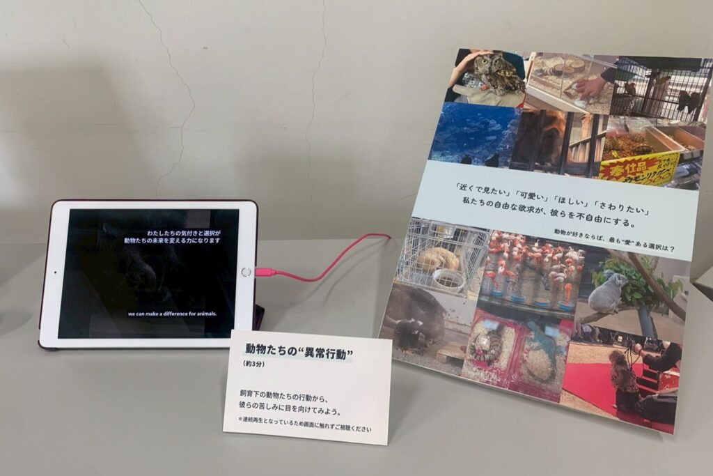 野生動物の飼育による影響を、パネルや動画にまとめました。飼育が“あたりまえ”となっている世の中で、その“あたりまえ”に疑問を持つ、そんな機会を作れたらと願い、設けたブースです。